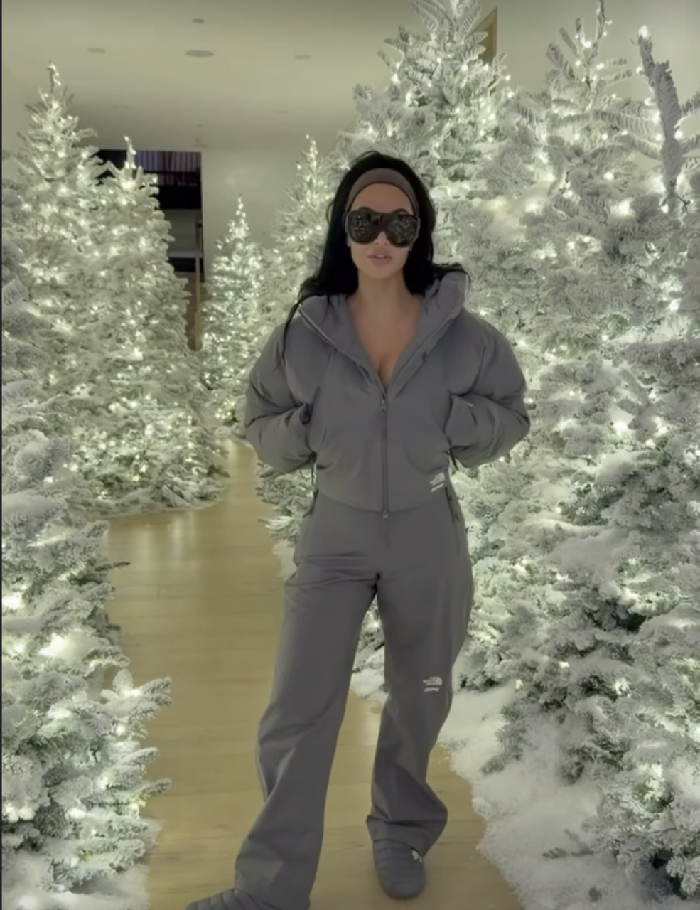Kim Kardašijan je svoj dom pretvorila u pravu zimsku šumu. Hodnik joj izgleda kao ledena bajka: nizovi snežno belih jelki, gusto prekrivenih veštačkim snegom i toplim belim lampicama, stvaraju efekat luksuznog zimskog tunela. Minimalizam kakav Kim obožava — ali maksimalan utisak. U sivom sportskom kompletu i ogromnim naočarima, prošetala je kroz svoju “šumu” i pokazala koliko joj je koncept čiste, mirne, snežne estetike postao zaštitni znak.