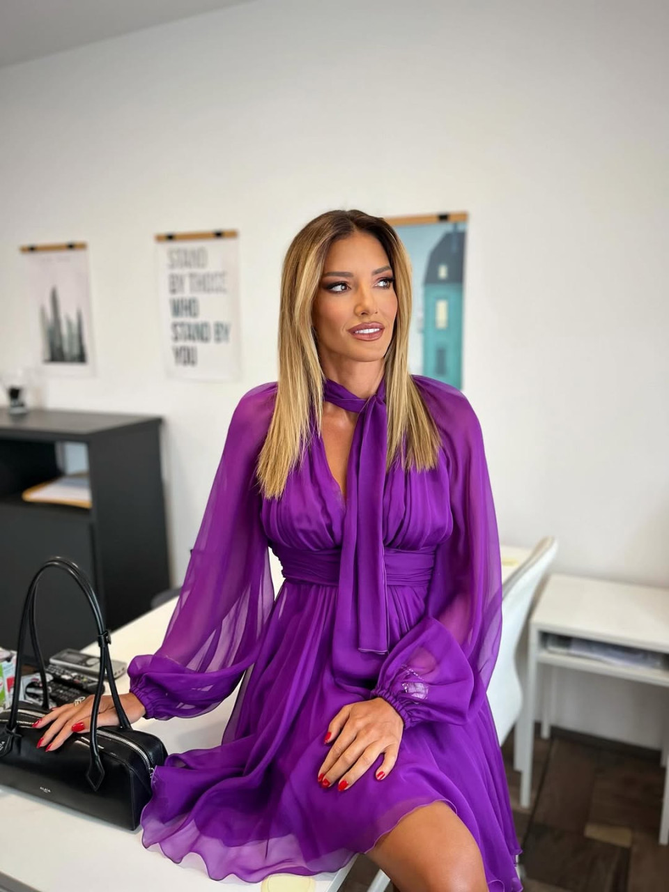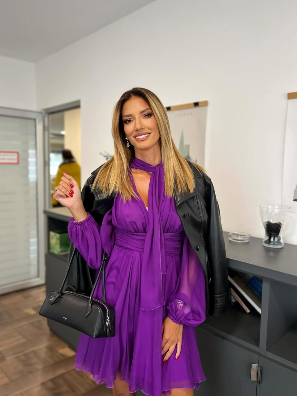 Voditeljka Jovana Joksimović ponovo je pokazala zašto važi za jednu od najbolje odevenih dama na domaćoj sceni. Ovog puta odlučila se za upečatljivu ljubičastu haljinu lepršavog kroja, idealnu za prelaz iz leta u jesen.