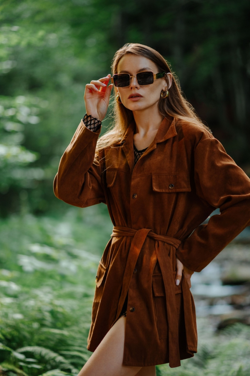 Trench model u smeđoj brušenoj koži — klasičan kroj sa modernim twistom