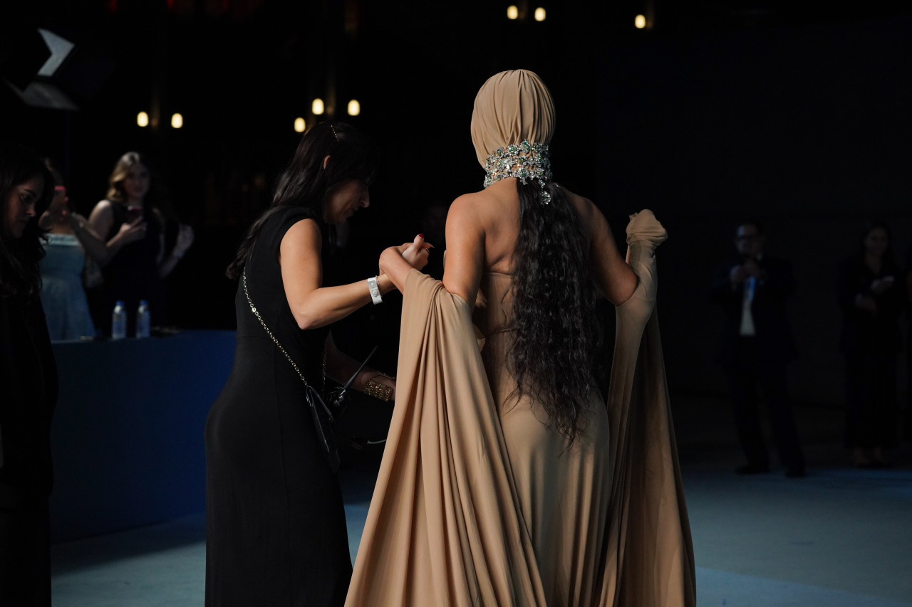 Kim Kardašijan iznenadila je sve pojavivši se u bež Margiela haljini sa potpuno prekrivenim licem, dok je blještava dijamantsko-smaragdna ogrlica zauzela glavno mesto u njenom izgledu.