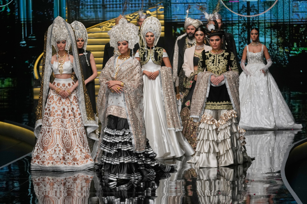 Prvi dan ove modne manifestacije bio je posvećen eleganciji bez viška – kremasti i mlečni tonovi, fluidni krojevi, bogata ručna izrada i detalji koji se ne nameću, ali ostavljaju snažan utisak. Umesto klasične zapadne bele venčanice, pakistanska mlada nosi lehenga siluete, dugačke bogato vezene haljine, duple velove i nakit koji ima jednaku težinu kao i sama haljina.