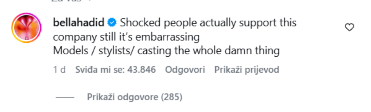 Posebnu pažnju izazvala je reakcija svetski poznate manekenke Bela Hadid, koja je javno izrazila razočaranje i poručila da je šokirana što ljudi i dalje podržavaju brend sa ovakvom istorijom kontroverzi. Njena izjava dodatno je rasplamsala raspravu i skrenula pažnju šire javnosti na ovaj slučaj.