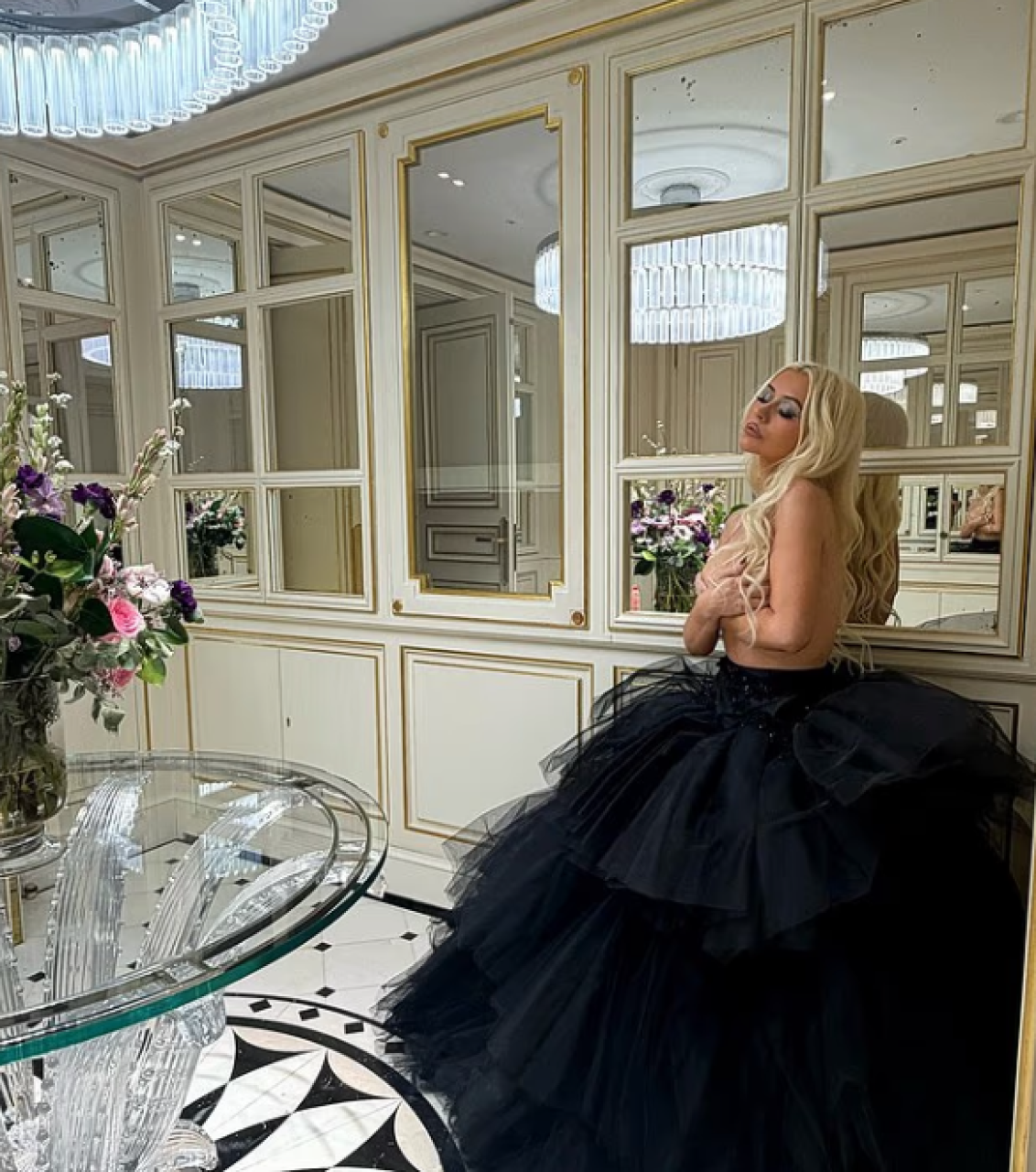 Kristina Agilera iznenadila je fanove kada je na Instagramu objavila seriju provokativnih fotografija nastalih tokom boravka u Parizu, gde je prisustvovala Nedelji visoke mode. Slavna pevačica (45) pozirala je u hotelskoj sobi bez gornjeg dela garderobe, diskretno prekrivajući grudi rukama, dok je na sebi imala samo upečatljivu dijamantsku ogrlicu, minđuše i raskošnu crnu suknju.