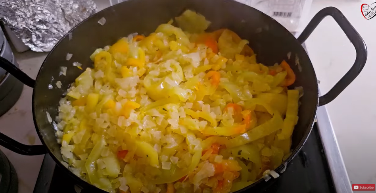 Crni luk sitno iseckajte i stavite da se dinsta na ulju dok lepo ne požuti. Papriku isecite na trake ili kocke, kako Vi volite, i dodajte je luku. Papriku pržite zajedno sa lukom dok lepo ne omekša.