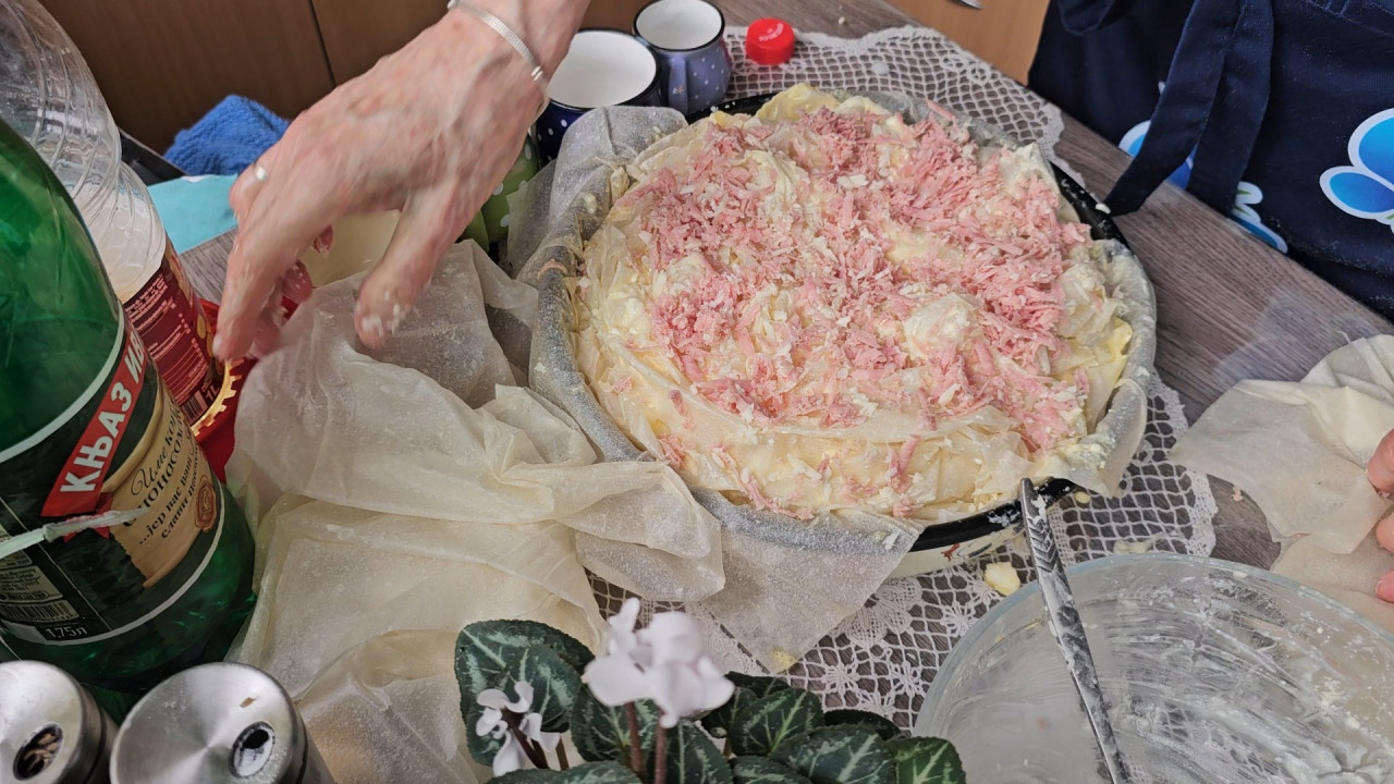 Staviti tri reda po dve kore i svaku umočiti u preliv. Na svaki treći red dodati rendanu šunku i kačkavalj pa rasporediti i tako do kraja. Ja sam imala tri reda šunke. Prekriti korama, premazati uljem i naprskati vodom. Poseći nožem u obliku krsta. Peči na 200 stepeni, C 50 minuta. Pred kraj pokriti folijom.