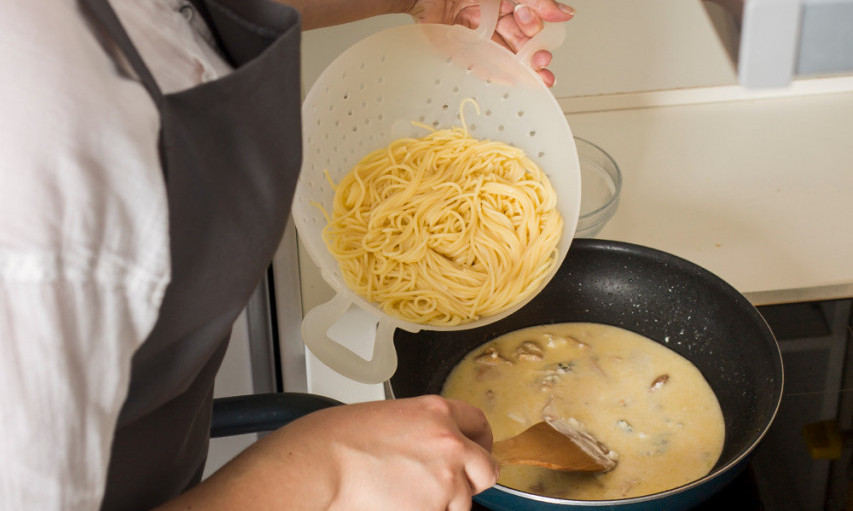 Ta voda, sa skrobom i salinom, ima sjajnu ulogu: kada je sačuvate i dodate pri mešanju testenine sa sosom, jelo dobija bolju strukturu i ukus. Ne bacajte sve: ostavite čašu ili dve te vode pre nego što procedite.