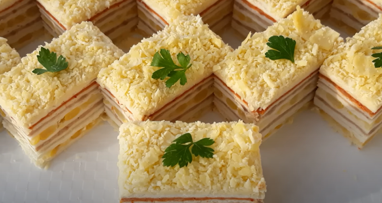 Na tacnu stavite prvu rozen koru i premažite je filom sa kukuruzom. Pokrijte sledećom korom pa premažite filom od tunjevine. Ponovite postupak sa filom od šargarepe i krastavčića. Nastavite da slažete dok ne potrošite sve kore i fil, vodeći računa da poslednji sloj bude osnovni fil (bez dodataka).
