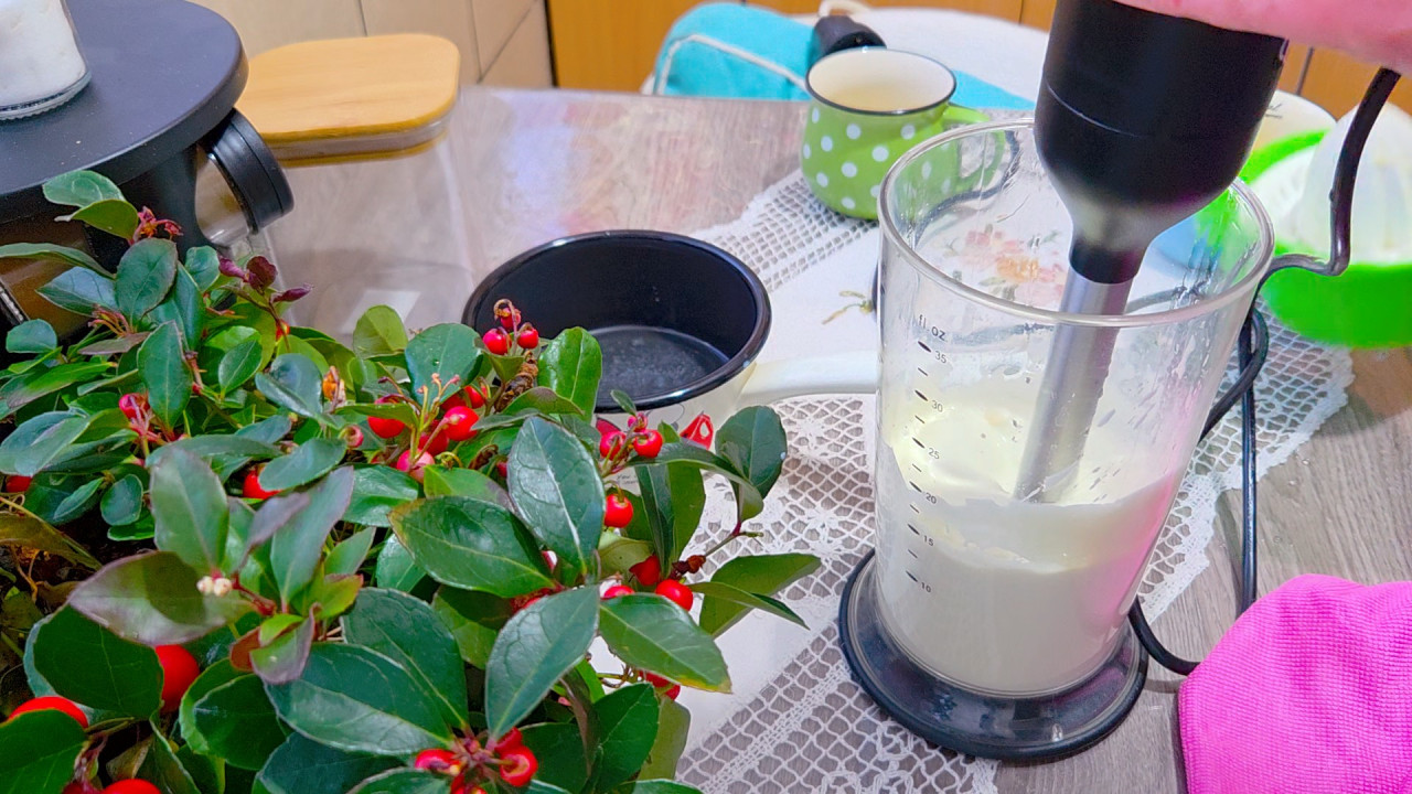 Priprema: U visoku, usku posudu (čašu štapnog miksera) sipajte sojino mleko, senf i so. Potopite štapni mikser skroz do dna posude.