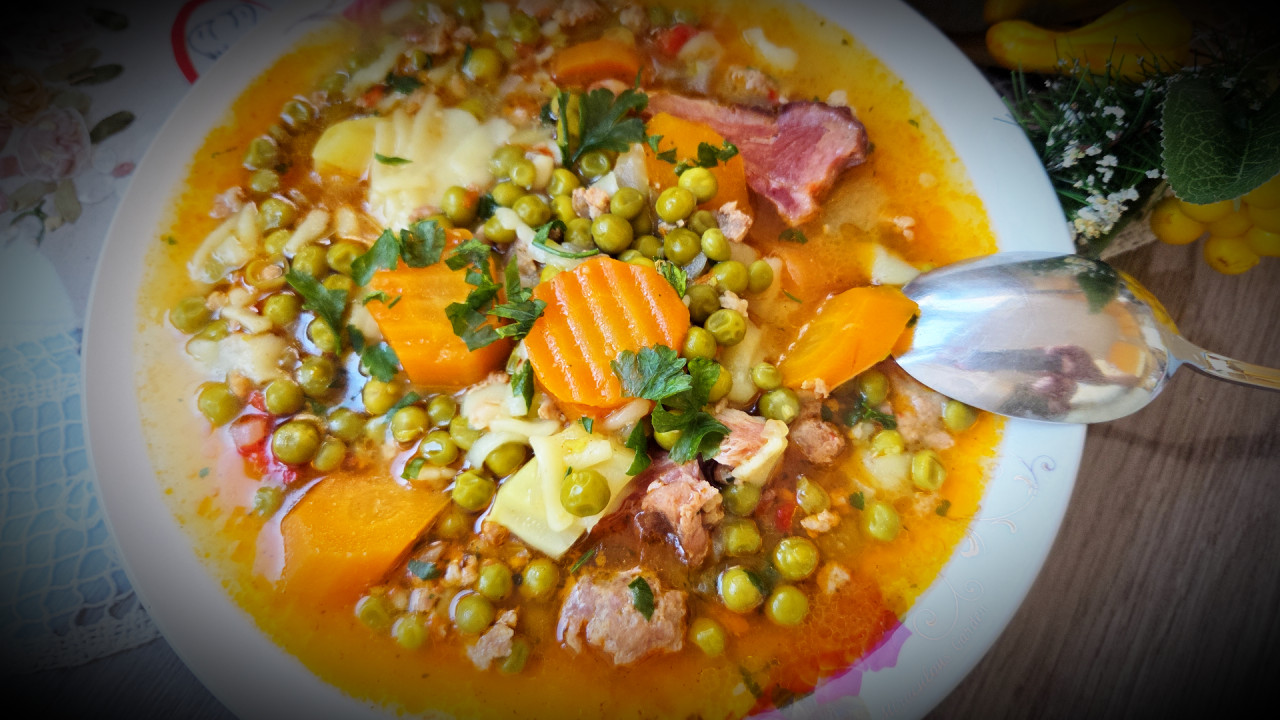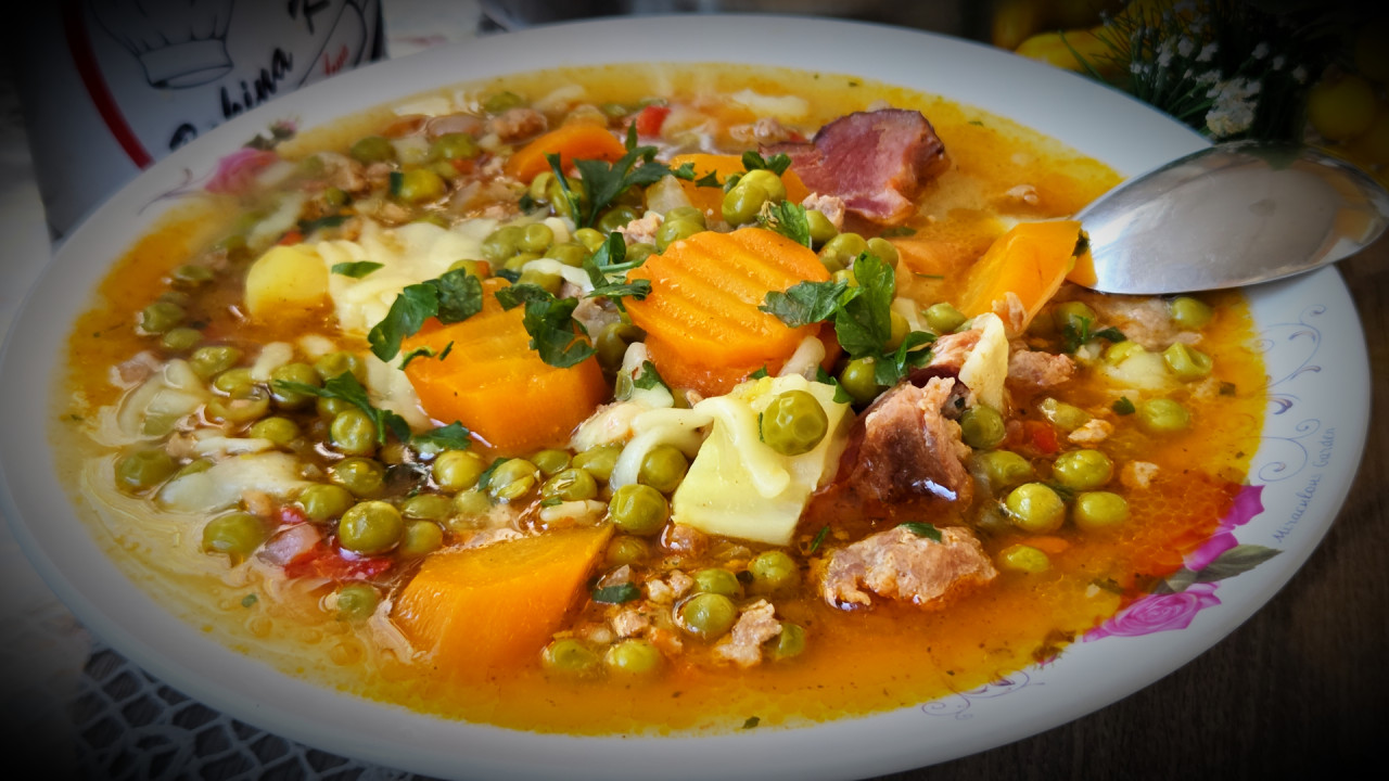 Na ulju se izdinsta sitno seckan luk i paprika i šargarepa a moze se dodati nekoliko kapi vode kad ona omekne, u to se dodaje mleveno meso i jedno rebarce i to se dinsta još jedno 10 minuta a posle toga se ubacuje grašak zajedno sa jednim krompirom seckanim na kocke. Ubaci se jedna puna kašičica slatke paprike dobro se izmeša i nalije se sa vodom to se ostavi da se kuva jedno 40 minuta. Na pola kuvanja ubaci se jedna do dve kašike širokih rezanaca i još kuvati 15 min. Dodati suvi začin i biber i na kraju peršunov list.