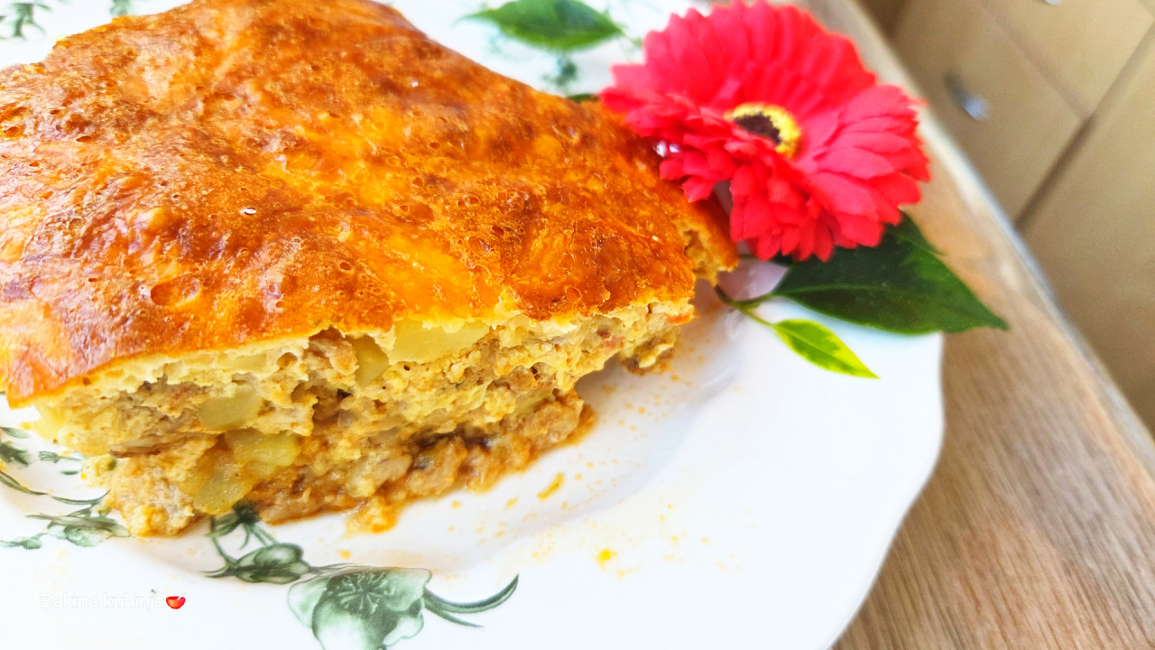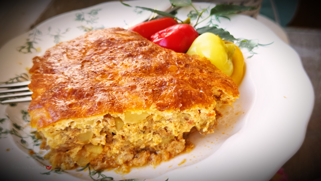 Najbolje je da odmah uzmeš neku šerpu ili dublji tiganj koji posle može da ide u rernu, da ne prljaš bezveze dva suda. Prvo sve iseckaj, praziluk sitno, papriku na kockice, beli luk isto sitno, a krompir na kocke. Sipaj ulje u tu šerpu da se zagreje pa stavi praziluk da se proprži dok ne omekša. Onda dodaj papriku i beli luk i kratko proprži. Zatim ubaci mleveno meso i odmah ga varjačom dobro iznječi i usitni dok se prži, da ne ostanu grudvice. Kad meso pobeli, dodaj onaj iseckan krompir. Sve to sada dobro začini po svom ukusu suvim začinom, biberom i alevom paprikom i dinstaj još malo da se ukusi lepo povežu. Skloni tu šerpu sa ringle i ostavi da se malo prohladi. Dok se meso hladi, u jednoj posebnoj činiji umuti žicom ona tri jaja, pa dodaj čašu kiselog mleka i čašu paveke i sve lepo sjedini.