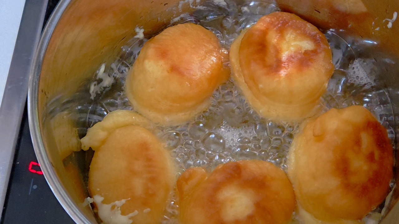 U činiju sipajte mleko i dodajte jaje, ulje i so, pa polako ubacujte brašno pomešano sa praškom za pecivo i mrvicom kvasca. Sve to dobro izlupajte žicom dok testo ne postane gusto tako da otpada u kupama kada podignete žicu. Tad je gotovo. Ulje zagrejte u tiganju da bude dubine oko dva prsta. Kašiku umočite u ulje, napunite je testom i spustite polako u ulje.
