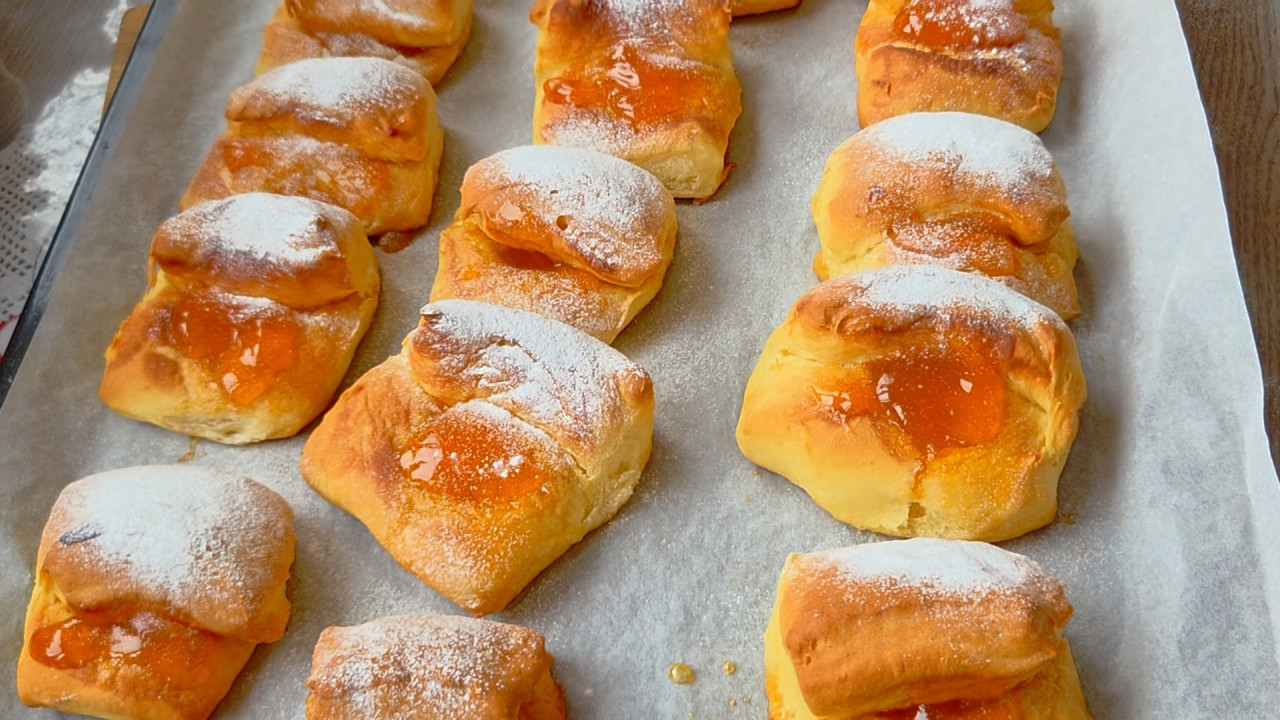 Milica MaksimovićOstavite na toplom da se udvostruči. Istresite testo na sto i poravnajte oklagijom u veliki četvorougaonik. Isecite na kvadrate i na svaki stavite kašičicu džema na manji deo pa većim delom preklopite preko džema.