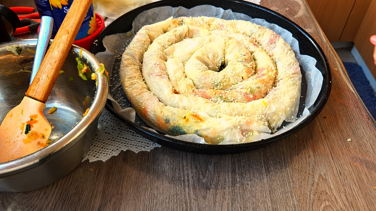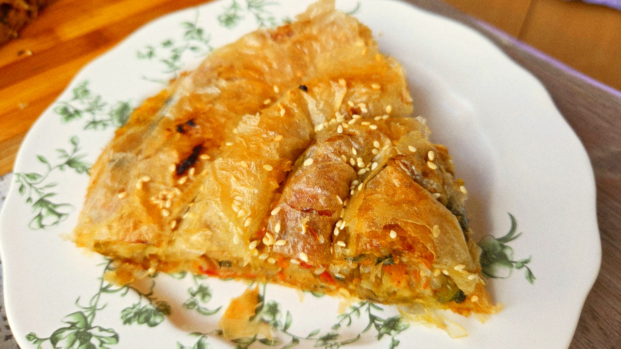 Ova posna pita je prava „intaktna” domaća čarolija koja mirisom „katapultira” pravo u detinjstvo. Spoj prženog praziluka mladog luka i pečene paprike daje joj sočnost piti kojoj niko ne može odoleti. Šaka oraha i pirinač iz gaze čine fil bogatim i drugačijim tako da svaka rolna „klizi niz grlo” ko od šale. Savršena je za doručak užinu ili bogat porodični ručak!