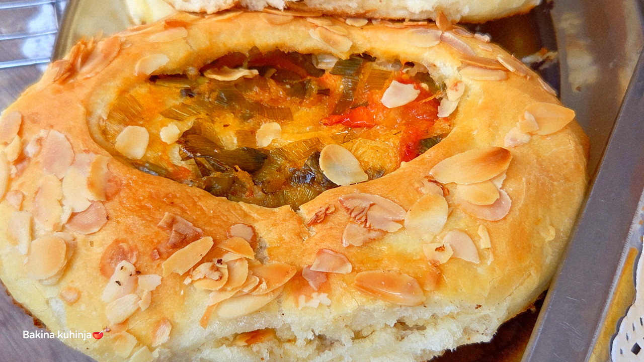 500 ml vode, 20 g kvasca, 1 kašičica šećera, 1 kašičica soli, 800 g brašna, 1 ljuta paprika, 1 praziluk, 1 paradajz, 1 kašika griza, začin, 100 g sira, 1 jaje, ulje, bademove ljuskice, kačkavalj, 1 kašika mleka