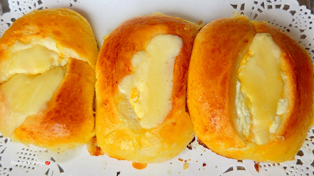 Svaku lopticu rukama razviti u krug, pa puniti – tri nadevom od praziluka, a tri nadevom od sira. Krajeve skupiti prstima i dobro zalepiti, pa oblikovati duguljasto pecivo. Okrenuti naopako, tako da zalepljeni deo ide dole u podmazan pleh, a glatka strana gore. Oštrim nožem, koji ste podmazali uljem, raseći svako pecivo uzduž i duboko, pa prstima dodatno razvući rez da se napravi oblik čamca. Ostaviti da poraste.