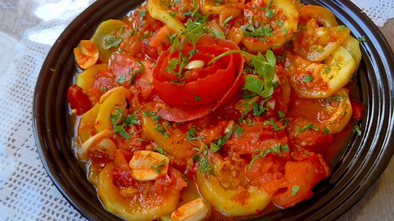 jedna tikvica, jedan paradajz, jedna kašika ajvara, jedna kašika ljutenice, ulje, suvi začin, peršunov list, beli luk