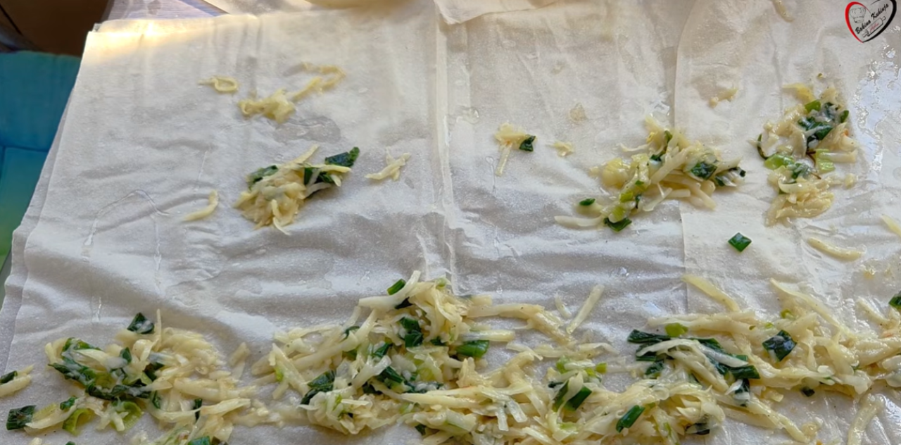 Mladi luk iseckajte i propržite na ulju pa dodajte rendani krompir i začine. Dve kore sastavite po dužini tako što ćete ih malo preklopiti jednu preko druge. Svaku koru poprskajte uljem pa nanesite nadev od krompira i luka i uvijte u dugačku tanku rolnicu.