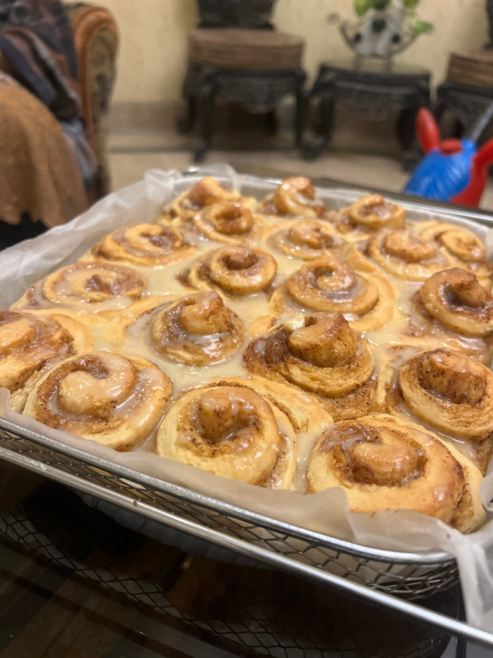 Dok su još tople, rolnice se prelivaju kremom od krem sira, šećera u prahu i vanile, uz dodatak malo mleka po potrebi. Ovaj sloj se lagano topi i ulazi u sve slojeve testa, dajući im dodatnu sočnost i bogatiji ukus.