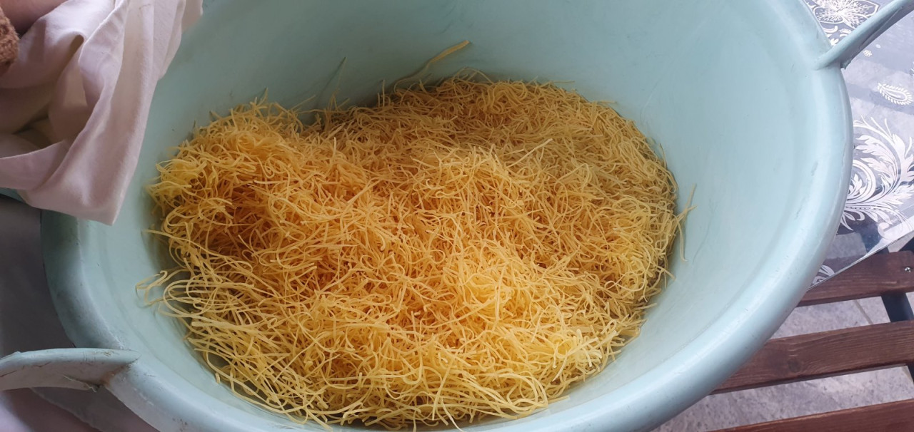 Ostavite razvijene kore da se malo prosuše – ne potpuno, već tek toliko da ne budu lepljive. Zatim svaku koru lagano uvijte u rolat i oštrim nožem secite tanke rezance željene širine. Rezance pažljivo rastresite rukama i rasporedite po stolnjaku, čistoj krpi ili stolu da se potpuno osuše.