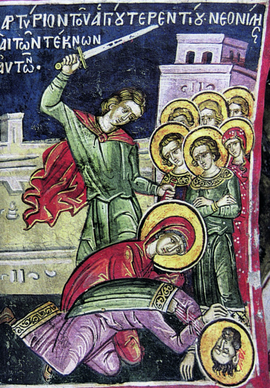 Sveti Terentije i Neonila bili su iz Sirije i poznati po tome što su svoju decu vaspitavali u duhu ljubavi, vere i pobožnosti. Njihov dom bio je mali hram – mesto molitve, utehe i dobrote. Kada su zbog svoje vere u Hrista bili optuženi i izvedeni pred sud, nisu se odrekli Boga, već su hrabro ispovedili da veruju u Hrista kao jedinog i istinitog Gospoda. Njihova deca, iako mala po godinama, pokazala su izuzetnu snagu duha i veru koja je nadvisila i odrasle. Porodica je odbila da prinese žrtvu lažnim bogovima, zbog čega su svi bili osuđeni na strašne muke.